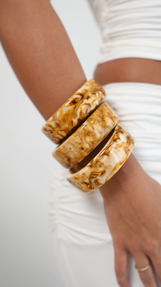 Bracelete em resina marmorizada. A peça tem acabamento liso e brilho suave, é leve e confortável, encaixa perfeitamente no pulso e é ideal para usar sozinho como destaque ou combinado com outros acessórios. O efeito marmorizado torna cada peça única, adicionando personalidade na medida certa. Para conservar o brilho, evite contato com calor excessivo, perfumes e produtos químicos.