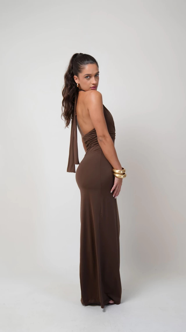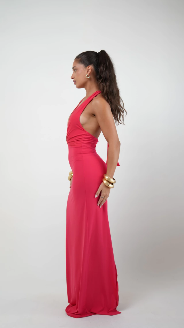 Vestido longo confeccionado em poliamida com elastano, com toque macio e caimento leve. Possui decote profundo com detalhe franzido que realça o busto. A parte de trás tem fenda que permite maior movimento ao caminhar e a amarração no pescoço dá um ajuste perfeito. A peça é confortável e versátil. É possivel amarrar as faixas no pescoço ou dar apenas um nó para um look mais clean. Possui forro e não fica transparente.